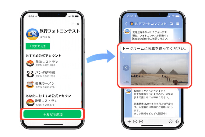 応募者・投票者ともにLINEログインによる認証を採用できます。これにより、ユーザーは手軽に参加できるだけでなく、自動的に友だち追加が促されるため、貴社のファンを自然な形で増やすことに繋がります。